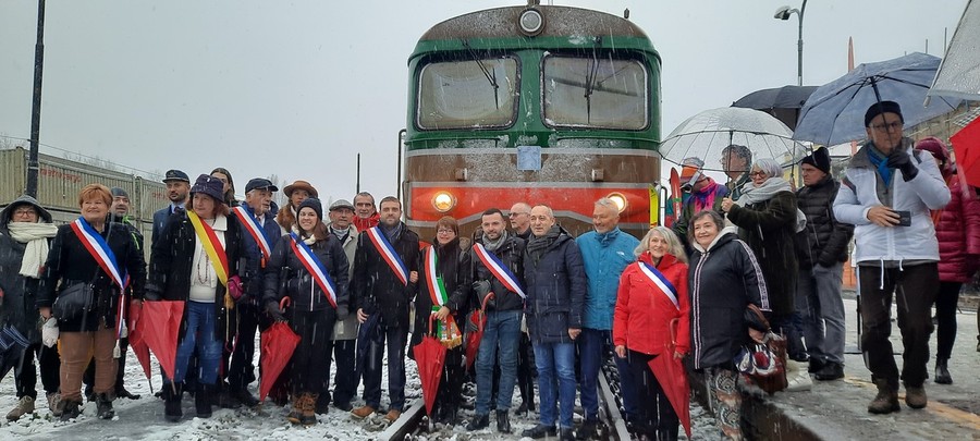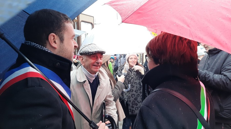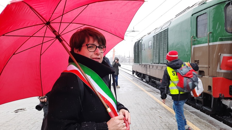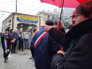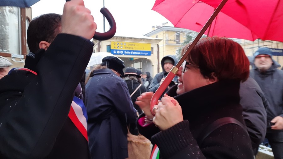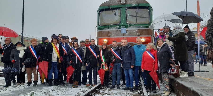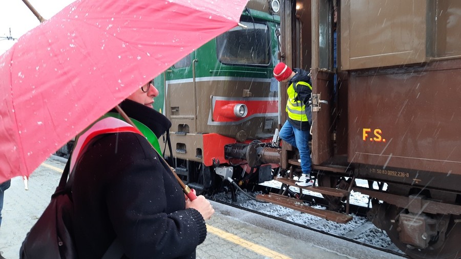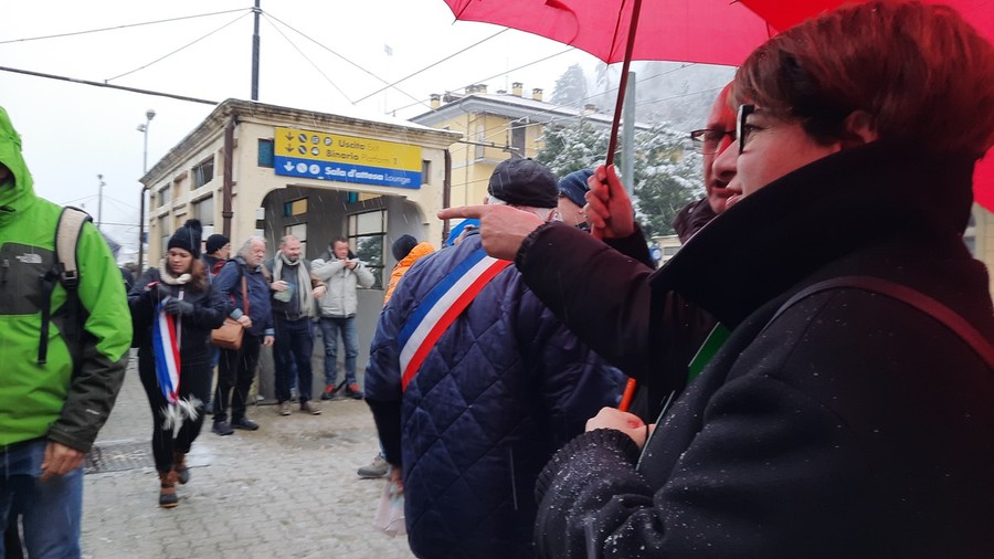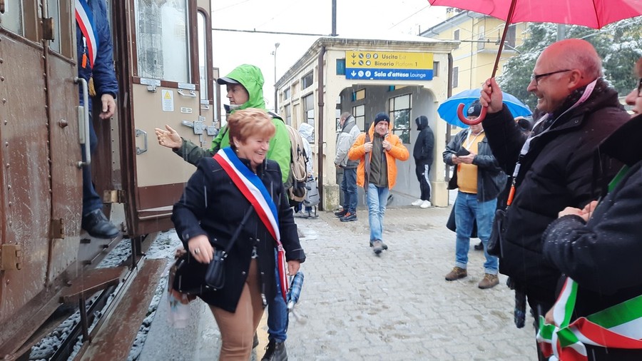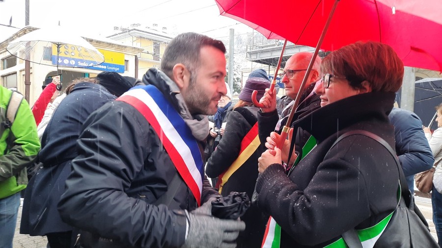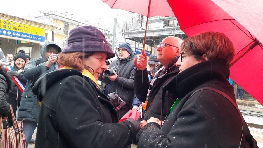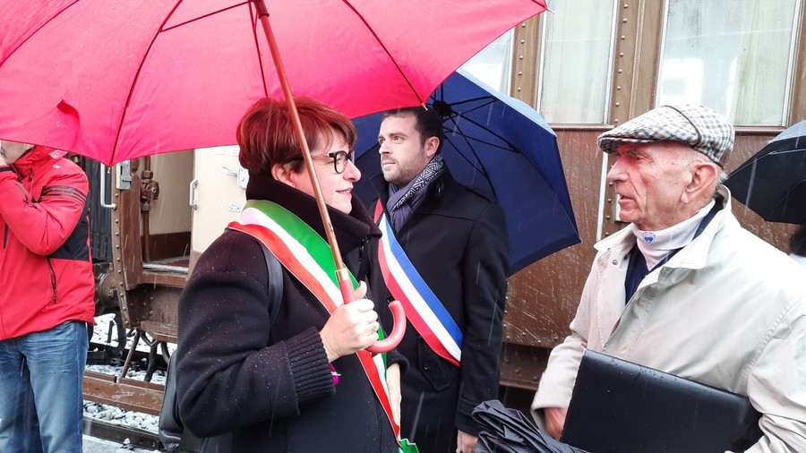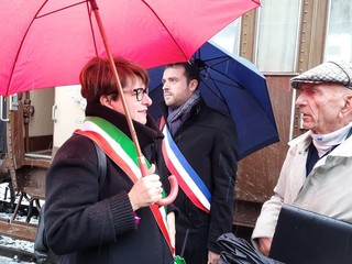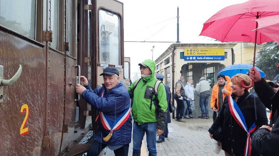La sindaca di Borgo Roberta Robbione ha accolto sul terzo binario il collega di Breil Sébastien Olharan, sceso dal treno storico insieme a tutti i primi cittadini della Val Roya.
