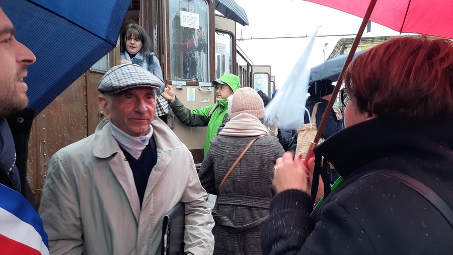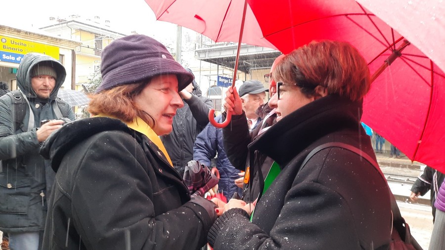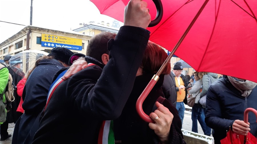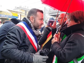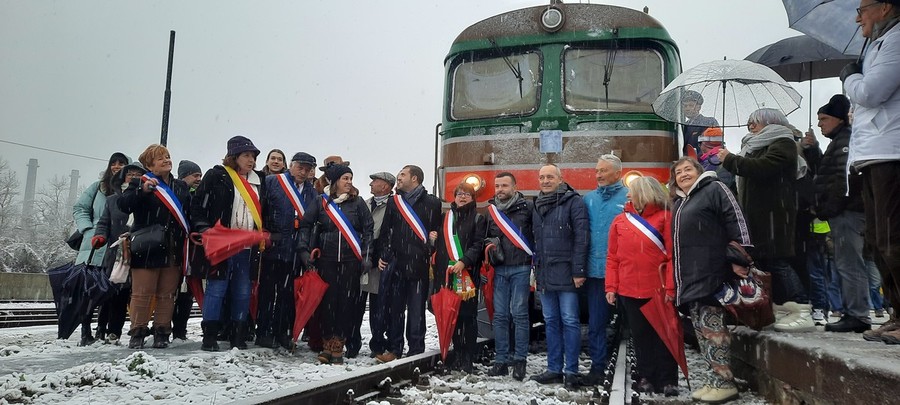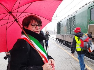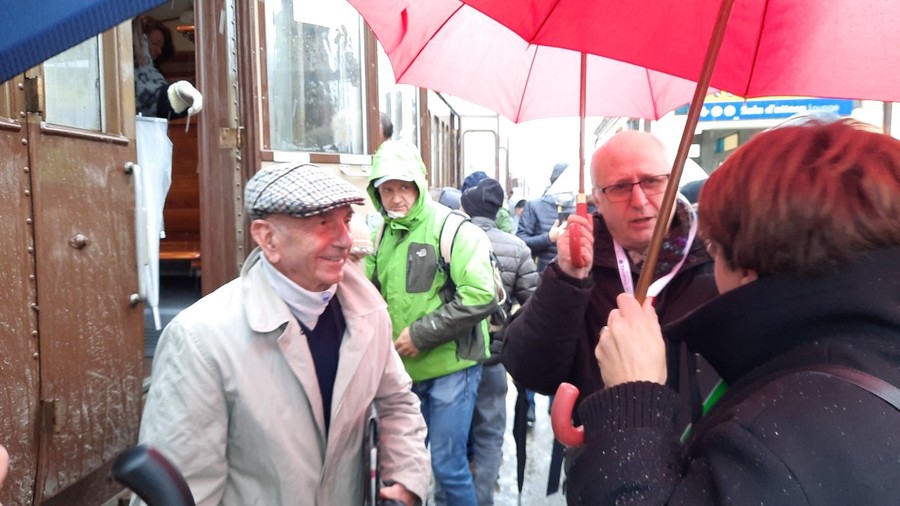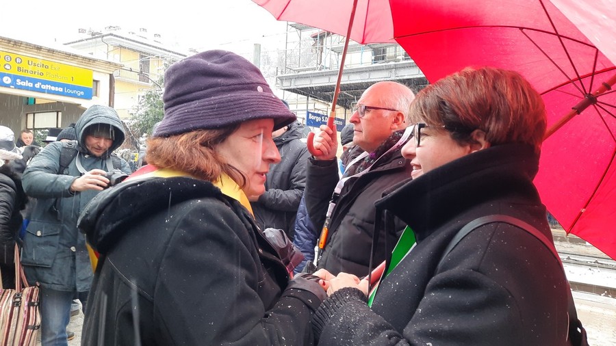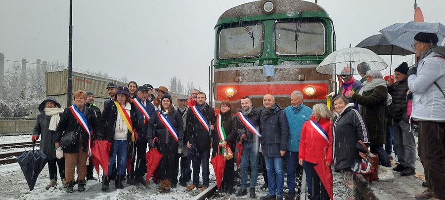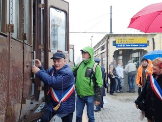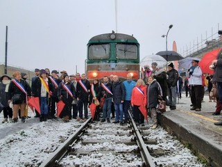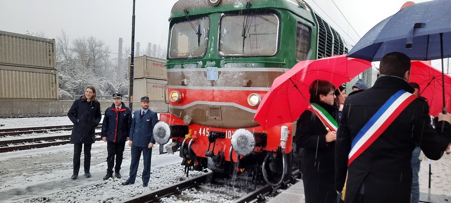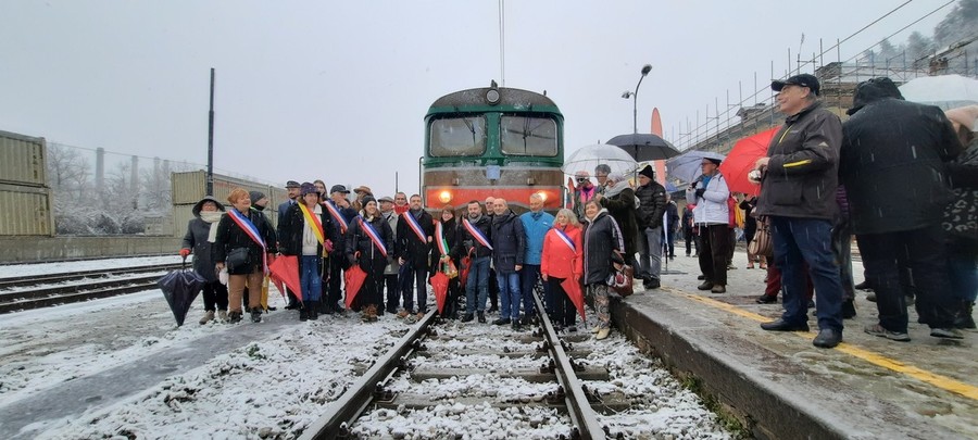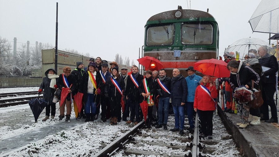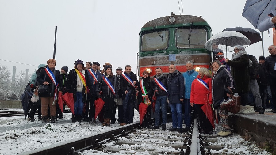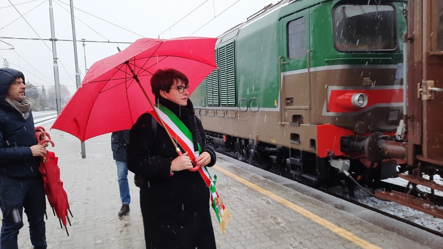 La sindaca di Borgo Roberta Robbione ha accolto sul terzo binario il collega di Breil Sébastien Olharan, sceso dal treno storico insieme a tutti i primi cittadini della Val Roya.