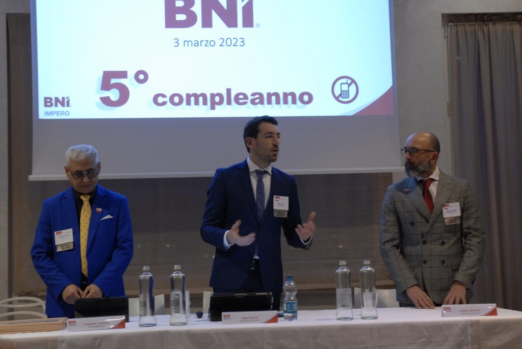 I membri che hanno aderito al più diffuso network al mondo di marketing referenziale e condotti da un comitato di gestione composto da Mirko Natta, Giuseppe Coppola e Pierre Cristiani hanno dato vita ai festeggiamenti del “capitolo Impero” di Bni che ha superato il quinto anno di vita.