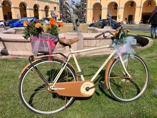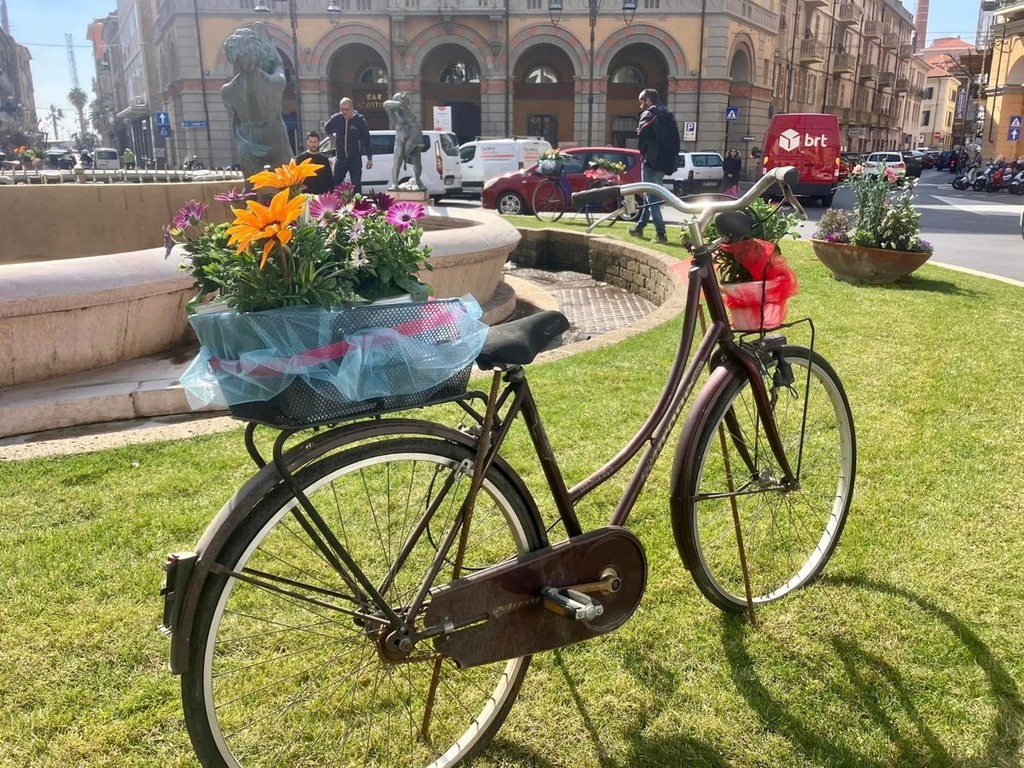 Imperia da sempre attende il passaggio della gara ciclistica con grande partecipazione ed entusiasmo. Alcune biciclette sono sistemate attorno alla fontana centrale per salutare i corridori.