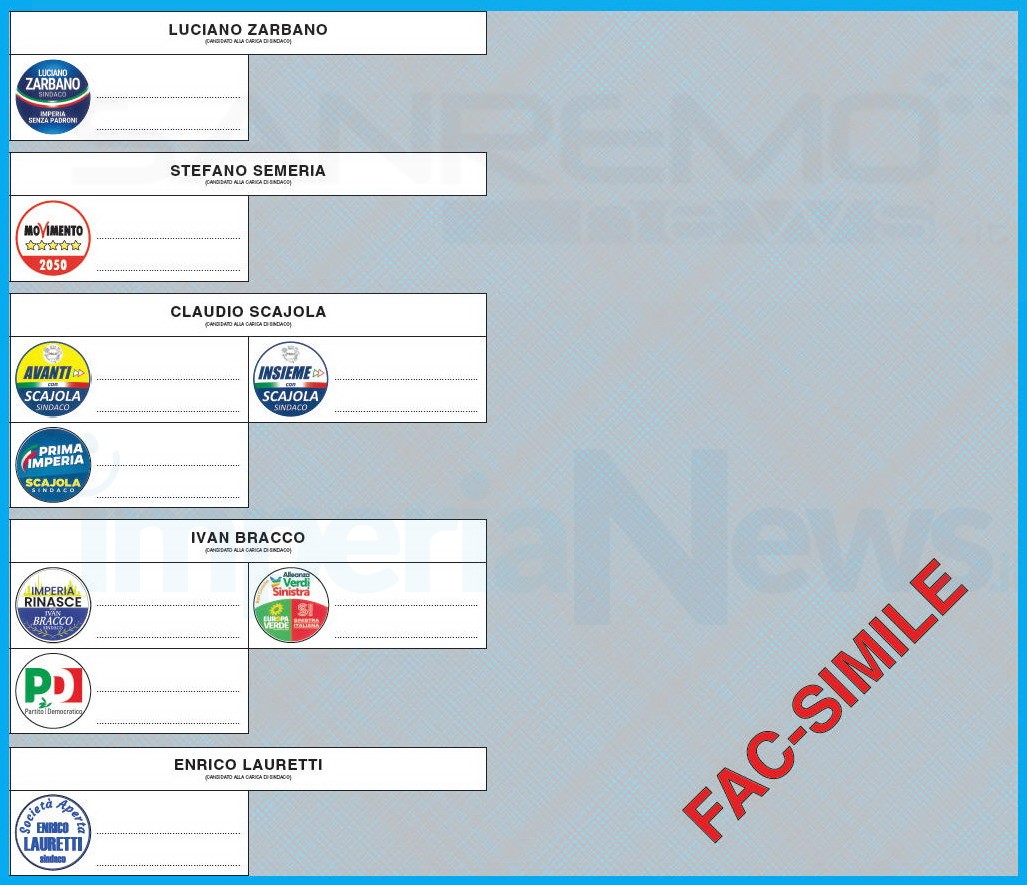 Ad Imperia sono cinque i candidati a Sindaco. Seguendo l’ordine della scheda elettorale troviamo Luciano Zarbano che, dopo le note vicende con Fratelli d’Italia, si candida con ‘Imperia senza padroni’. Quindi Stefano Semeria con il Movimento Cinque Stelle e Claudio Scajola, attuale sindaco che porta tre liste civiche: ‘Avanti’, ‘Insieme’ e ‘Prima Imperia’. Quello che è considerato il suo maggiore antagonista è Ivan Bracco che si presenta con la lista civica ‘Imperia rinasce’ e con ‘Alleanza Verdi Sinistra’ e il Parttito Democratico. Infine troviamo Enrico Lauretti con la lista ‘Società aperta’.