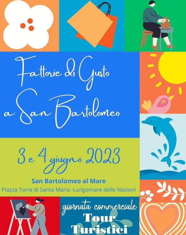 L’appuntamento con Fattorie di Gusto a San Bartolomeo al Mare è fissato per domani (dalle 9 alle 20) e domenica (dalle 9 alle 18). Due giorni di festa attendono turisti e cittadini, accolti in Piazza Torre Santa Maria per l’evento organizzato da Confesercenti, con il patrocinio del Comune di San Bartolomeo al Mare.