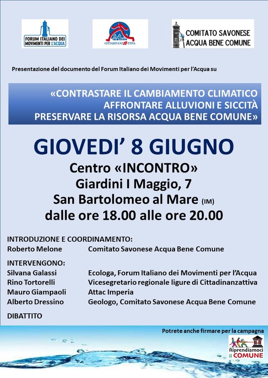 A San Bartolomeo al Mare giovedì 8 giugno presso il Centro Incontro ai Giardini I Maggio 7 dalle 18 alle 20, si terrà un incontro su "Siccità, alluvioni, frane: meglio, molto meglio prevenire!".