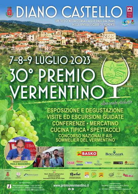 Il 30° Premio Vermentino, promosso dal Comune di Diano Castello, è sostenuto da Regione Liguria e Azienda Speciale della Camera di Commercio Riviere di Liguria, inoltre si avvale del patrocinio del Ministero dell’agricoltura, della sovranità alimentare e delle foreste, dell’Associazione Nazionale dei Borghi più belli d’Italia, della Prefettura e della Provincia di Imperia. Contribuiscono alla realizzazione dell’evento anche Supermercati Basko (main sponsor), Banca d’Alba (sponsor), Intesa Grandi Impianti, Rastal, Mgs Carta e Barisone Immobiliare, Elena Pasticceria, Pasta Fresca e Liguria Food (partner). L’organizzazione si avvale della collaborazione di Fisar, Ais e Amici del Castello. Quest’ultima associazione proporrà, nelle serate di sabato 8 e domenica 9 luglio, la sua popolare Festa in Ciassa, con tante specialità gastronomiche e buona musica. Non mancherà, ovviamente, il Vermentino.