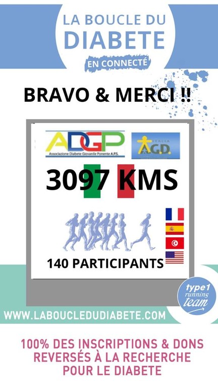 "In 180 percorsi differenti raggiunti 3097 km a piedi, in bicicletta, chi da solo, in famiglia o in gruppo in cinque 5 stati partecipanti: Italia, Francia, Spagna, Tunisia e USA. Sono stati 140 i partecipanti all'iniziativa di Type 1 Running Team" - conclude.