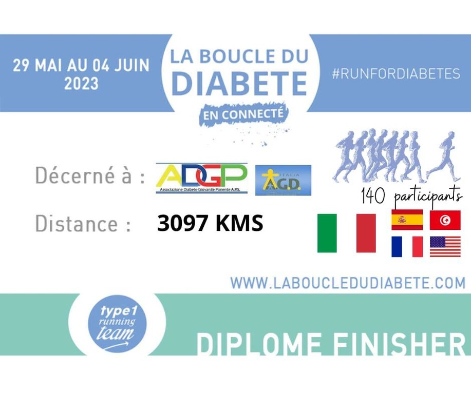 Come ogni anno, l’associazione Type 1 Running Team, affiliata alla Federazione francese di atletica leggera specializzata nel supporto di corridori e camminatori diabetici, ha organizzato, dal 29 maggio al 4 giugno, un raduno sportivo amichevole attorno a una sfida ormai mondiale. L’obiettivo primario di questa competizione è quello di raggruppare quante più persone possibile sensibilizzandole sul diabete di tipo 1. Adgp Aps per il secondo anno ha partecipato e grazie ad ogni singola persona ha accumulato 3097 km ottenendo il terzo posto in classifica. In premio nulla se non la felicità di aver potuto contribuire facendo informazione e vedere così tante persone che fisicamente hanno perorato la causa.