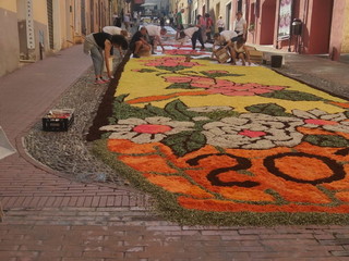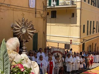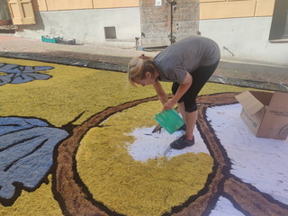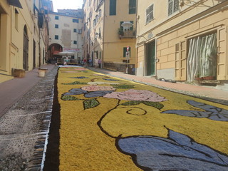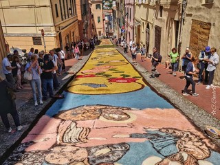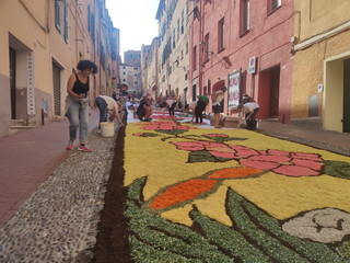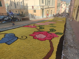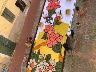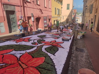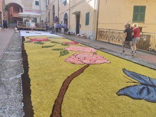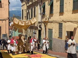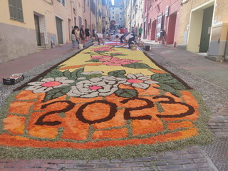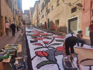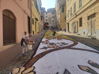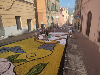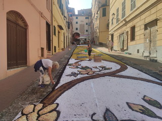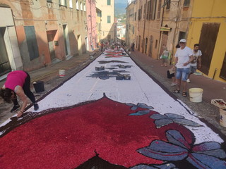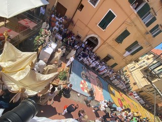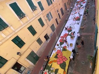 Una splendida giornata di sole ha accompagnato l'Infiorata del Corpus Domini, realizzata come ogni anno dalla Compagnia di via Carducci, che ha steso la composizione floreale lungo i 120 metri della via di Porto Maurizio, che collega via Cascione con il Parasio. La composizione, larga 4 metri occupa una superficie di 500 metri quadrati con oltre 10 milioni di petali utilizzati. I lavori di allestimento sono iniziati ieri mattina, e sono andati avanti per tutto il giorno. Questa mattina all'alba gli ultimi ritocchi in vista del passaggio della processione del Corpus Domini. Sempre colorati e fastosi i quadri saranno visibili poi fino a questa sera.