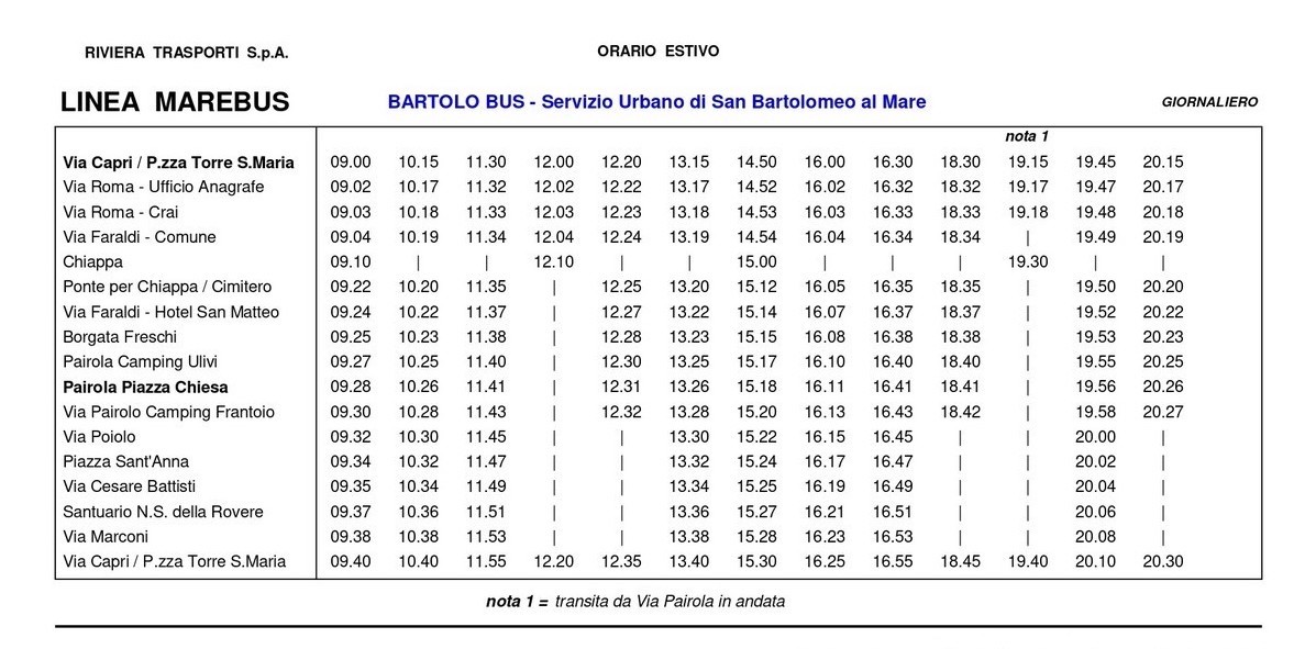 Il percorso ad anello parte da piazza Torre Santa Maria e raggiunge Chiappa, Borgata Freschi, Parola, Poiolo e la Rovere. Grazie al BartoloBus, turisti e residenti possono raggiungere il mare partendo dalle frazioni senza pagare alcun biglietto ed evitando di utilizzare l'auto per raggiungere il lungomare o tornare alla propria abitazione o sistemazione. Il servizio è realizzato da Riviera Trasporti, in collaborazione con il Comune di San Bartolomeo al Mare.