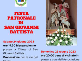 24 giugno, festa patronale di San Giovanni Battista, messa solenne, processione, concerto della band “Esapop” e aperitivo (Piazza Vittorio Em. II) dalle 19.30.