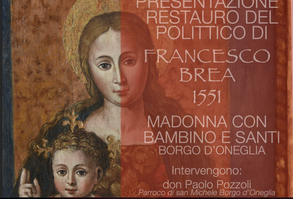 Presso la chiesa parrocchiale della Sacra famiglia di Imperia, sabato 29 luglio alle ore 21.30 si terrà la presentazione del restauro del Polittico di Francesco Brea, risalente al 1551 "La Madonna con bambino e Santi" conservato a Borgo d'Oneglia.