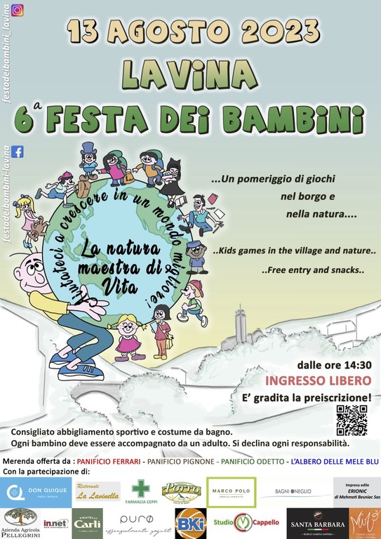 A Lavina, piccolo borgo nell’entroterra imperiese, il 13 agosto ci sarà la 6ª edizione della “Festa dei Bambini”. A partire dalle 14.30, percorrendo il paese e il torrente, i bambini dai 3 ai 13 anni potranno mettersi alla prova con giochi di abilità, destrezza e coraggio: “Sacco Matto”, il “Ponte Sospeso” e molti altri. Disponibile anche l'angolo 0-3.