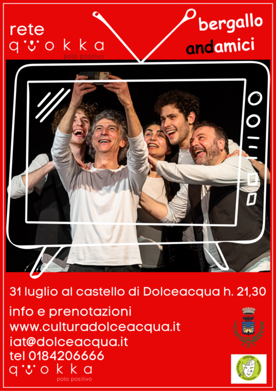 21.30. Teatro cabaret di Bergallo Andamici con ‘Rete Quokka’: boomer, generazione X, millennials e post millennials uniti sul palco tra cabaret, teatro, musica e stand-up di gruppo. Con: Raffaele Barca, Alessandro Bergallo, Raffaele Casagrande, Antonella Loliva, Matteo Traverso. Castello dei Doria, info 0184 206666 (anche WhatsApp)