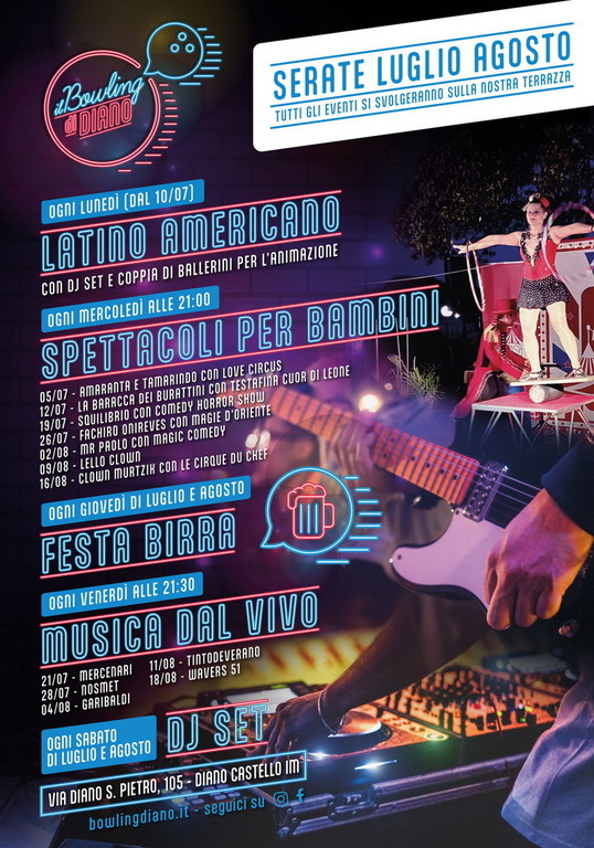 Il Bowling di Diano (bar, minigolf, sala giochi, sala bowling) in estate è aperto tutte le sere, dalle ore 20. Per informazioni e prenotazioni, telefonare allo 0183.494131.