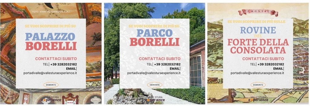 Il consorzio Valle Stura Experience unisce alle visite guidate di Palazzo Borelli anche le visite al Parco Borelli e alle Rovine del Forte della Consolata. Si avrà la possibilità di scoprire il parco ottocentesco, uno dei più bei giardini del Piemonte realizzato su quattro terrazze e caratterizzato da un’ampia varietà di alberi e siepi provenienti da tutto il mondo, grazie all’accompagnamento di una guida escursionistica e un erborista.