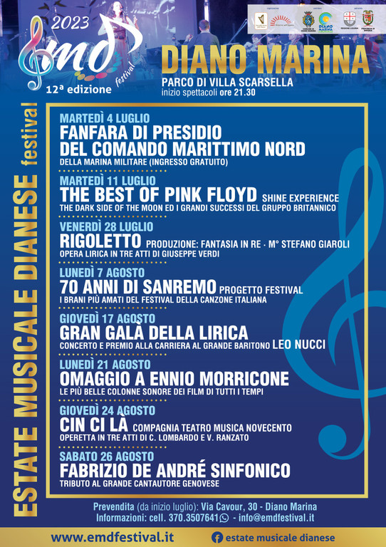 "Per l’Omaggio a Morricone si va verso il tutto esaurito. Praticamente esauriti i posti del primo settore. Restano a disposizione tagliandi (numerati) per la seconda parte della sala. Per acquisto (non sono previsti diritti di prevendita) e prenotazioni rivolgersi in via Cavour 30, a Diano Marina, oppure telefonare 370.3507641 (anche whatsapp) o scrivere a info@emdfestival.it. Il botteghino domani aprirà intorno alle 19" - concludono gli organizzatori.