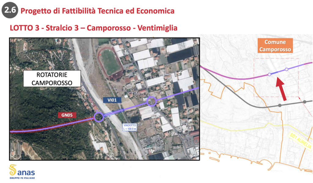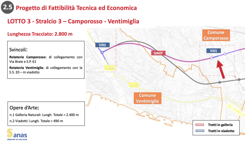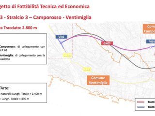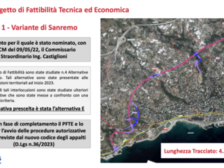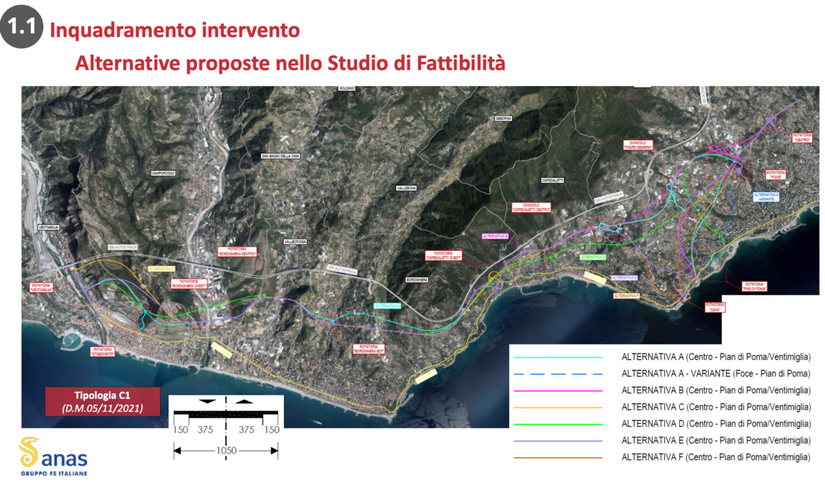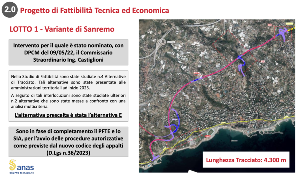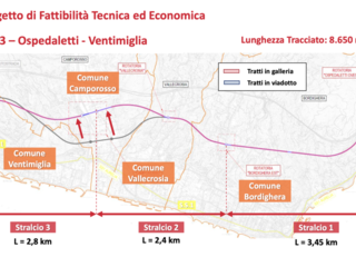 Per la realizzazione del primo lotto è stato nominato un Commissario straordinario con dPCM del 9 maggio 2022. Nello studio di fattibilità del lotto 1 sono state studiate 4 alternative di tracciato, presentate alle amministrazioni territoriali ad inizio 2023. A seguito delle interlocuzioni sono state studiate ulteriori due alternative che sono state messe a confronto con una analisi multicriteria. L’alternativa prescelta è stata l’alternativa definita ‘E’: Centro, Pian Poma/ Ventimiglia. Attualmente sono in fase di completamento il PFTE e lo SIA, per l’avvio delle procedure autorizzative come previste dal nuovo codice degli appalti (D.Lgs n.36/2023).