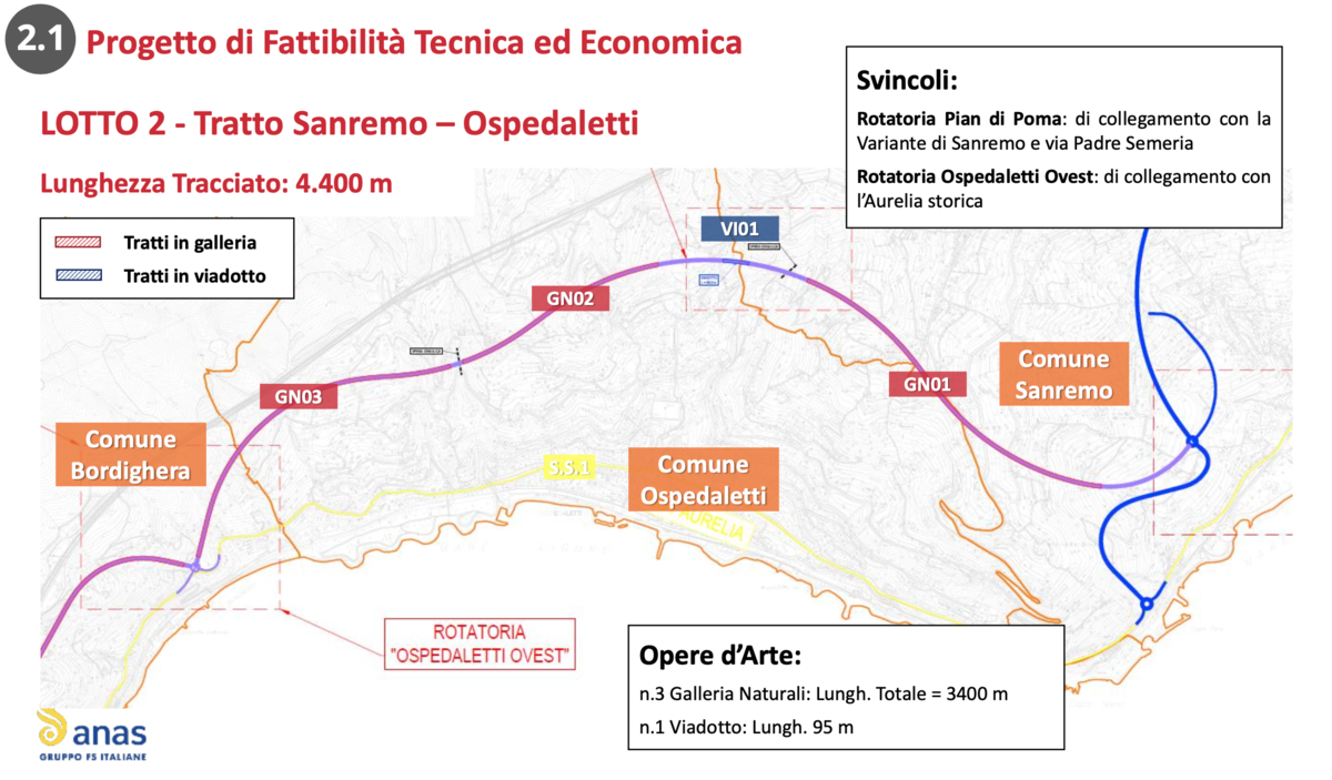 Il Lotto 2 si sviluppa tra Sanremo e Ospedaletti e prevede la realizzazione a) delle Rotatoria Pian di Poma: di collegamento con la Variante di Sanremo e via Padre Semeria, b) della Rotatoria Ospedaletti Ovest: di collegamento con l’Aurelia storica.