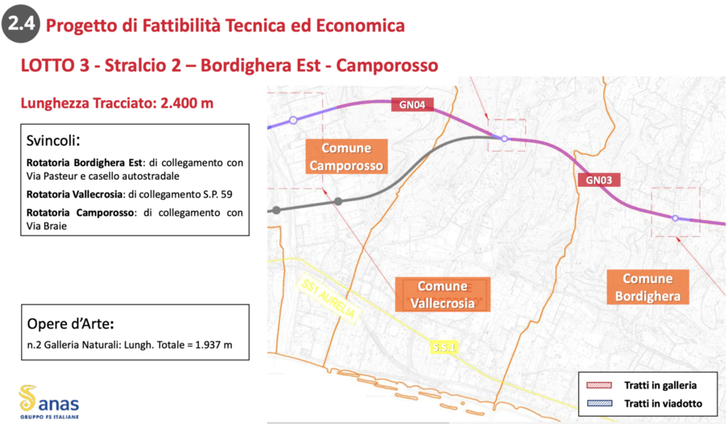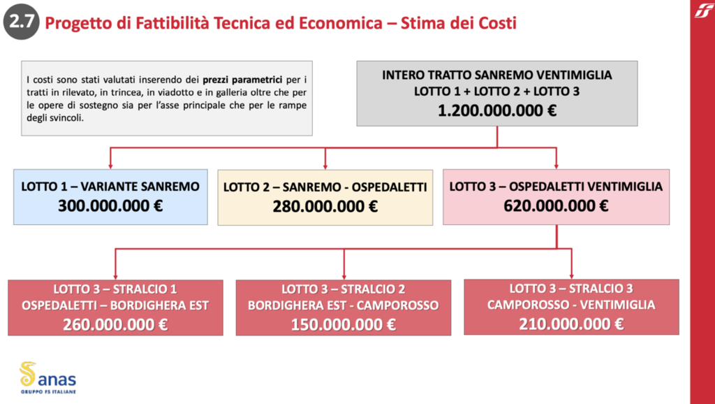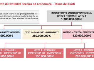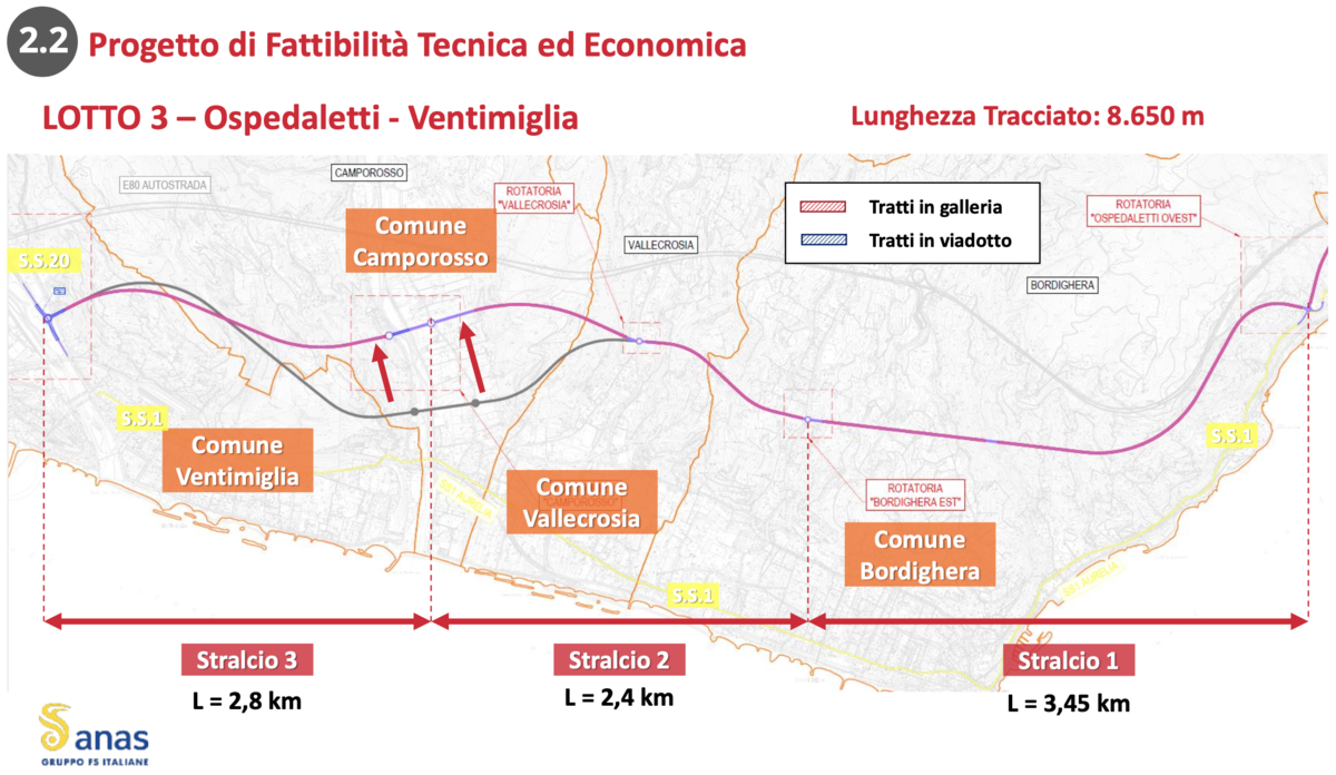 Il Lotto 3 si sviluppa tra Ospedaletti e Ventimiglia interessando anche i Comuni di Camporosso, Vallecrosia, Bordighera. Il lotto 3 è, a sua volta ripartito in più stralci. Il costo stimato dell’intero collegamento è pari 1,2 miliardi di euro, soggetto ad aggiornamento. Il lotto 1 ha un costo stimato in circa euro 300 milioni.