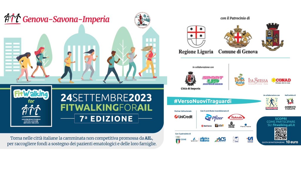 La manifestazione, organizzata su tutto il territorio nazionale in 24 città, in Liguria si terrà a Genova, Savona e Imperia il prossimo 24 settembre dalle ore 10 alle 12. Le tappe liguri di “FitWalking for AIL” sono organizzate da AIL Genova Savona Imperia Odv con il supporto di My Trekking APS, la collaborazione di Comune di Imperia e di SportUp Savona 2023 e il patrocinio di Regione Liguria, Comune di Genova, Comune di Savona e Polizia di Stato.
