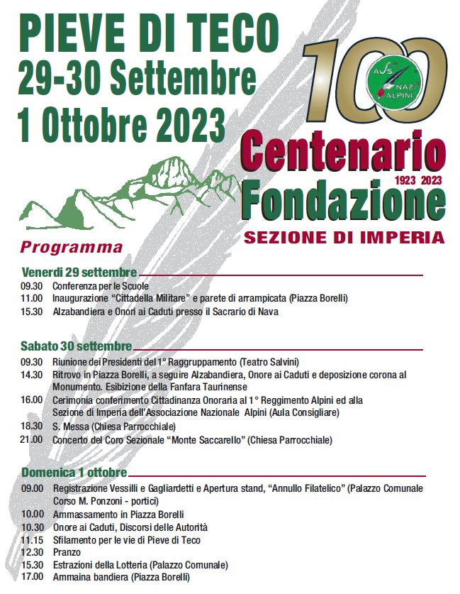 9.30. Raduno degli Alpini: tre giorni di festeggiamenti per il Centenario dalla fondazione della Sezione provinciale dell'Associazione nazionale alpini con il coinvolgimento di tutte le Sezioni di Liguria, Piemonte, Valle d’Aosta e della Sezione Francia (il programma nella locandina)