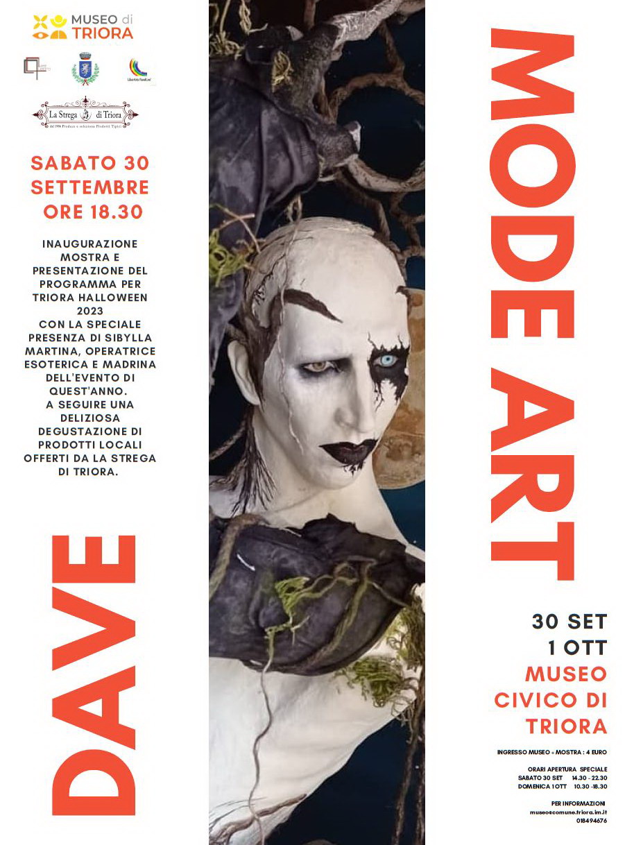 18.30. Inaugurazione della mostra di Dave Art, artista modenese con installazioni e sculture suggestive e coinvolgenti realizzate con materiale di recupero come cartone, polistirolo, polistirene, carta, stoffa carta legno e ovatta + presentazione in anteprima del programma ufficiale di ‘Triora Halloween 2023’ + degustazione di prodotti tipici a cura dell’azienda locale ‘La strega di Triora’. Palazzo Stella (locandina)