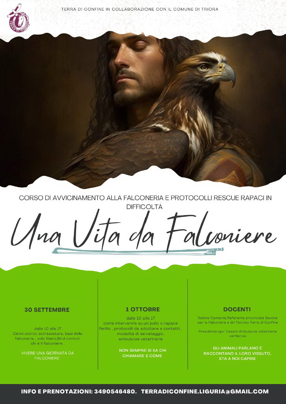 10.00-17.00. Corso di avvicinamento alla falconeria tenuto da Sabrina Camarda, falconiera e guardia zoofila, e Igor Cassini che da anni si occupa di soccorso veterinario. Evento a cura dell’Associazione Terra di Confine, informazioni e prenotazioni 3490546480 o mail a terradiconfine.liguria@gmail.com (locandina)