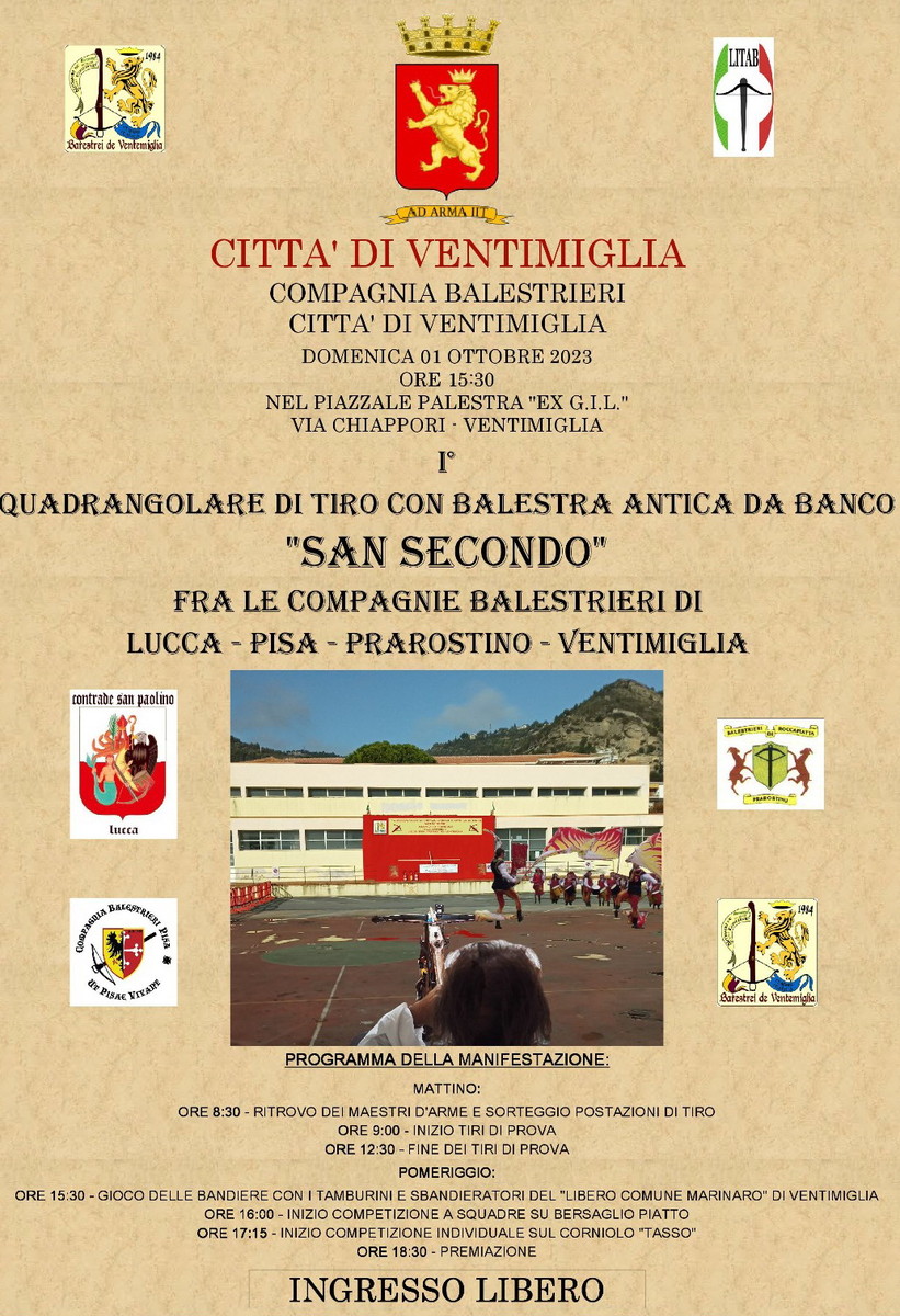 8.30-18.30. Quadrangolare di tiro con balestra antica da banco ’San Secondo’ fra le compagnie balestrieri di Lucca, Pisa, Prarostino, Ventimiglia. Ex GIL, via Chiappori, ingresso libero (il programma nella locandina)