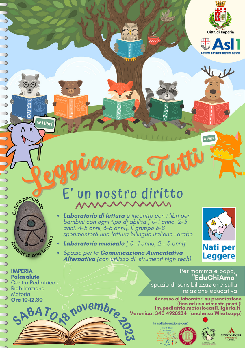10.00-12.30. Nell'ambito dell'iniziativa ‘Nati per leggere’ appuntamento con la lettura dedicata ai più piccini ‘Leggiamo tutti’. Centro Pediatrico di Riabilitazione Motoria del Palasalute (tre i laboratori disponibili su prenotazione al numero 340 4928234 o via posta elettronica all'indirizzo im.pediatria.motorio@asl1.liguria.it) (locandina)