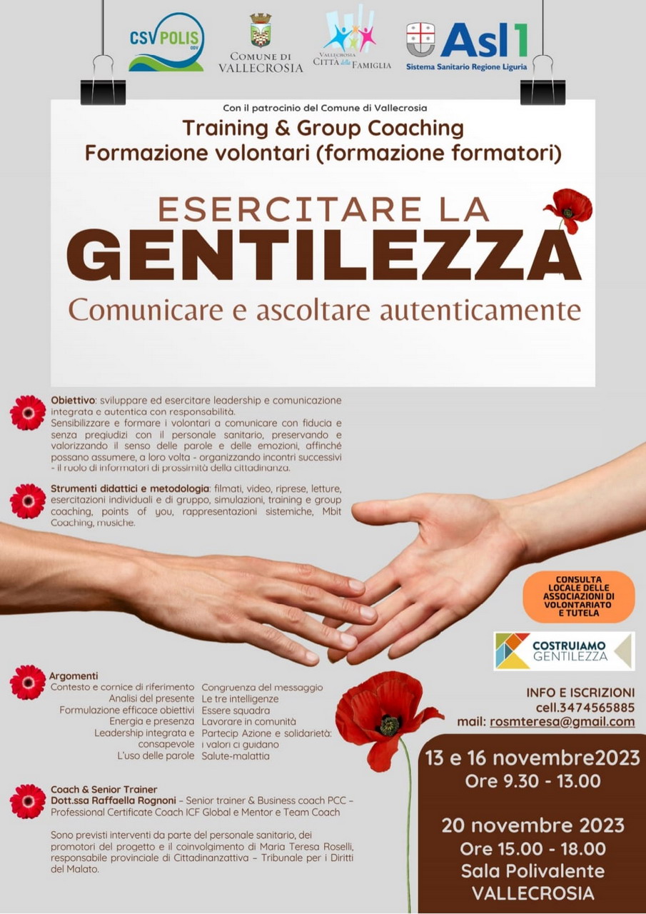 15.00-18.00. Corso di formazione relativo al progetto ‘Esercitare la Gentilezza - Comunicare e Ascoltare Autenticamente’ rivolto ai volontari delle Associazioni e ai cittadini interessati. Sala Polivalente del Comune, partecipazione libera (locandina) JPG Locandina Corso Vallecrosia