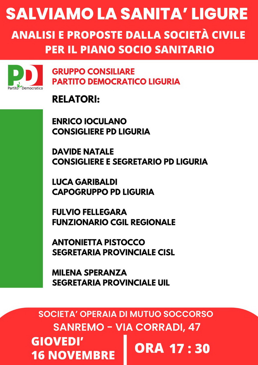 17.30. ‘Salviamo la sanità ligure’: convegno per fare un'analisi della situazione ligure in vista dell'approvazione del nuovo piano socio sanitario regionale. Iniziativa organizzata dal gruppo PD Liguria. Federazione Operraia, via Corradi 47 (locandina)
