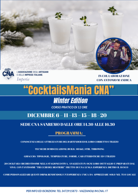 CNA Imperia propone una nuova edizione del corso “CocktailsMania CNA” Winter Edition in collaborazione con il rinomato bartender di Sanremo, Antonio Mandica. Si tratta di un corso da 12 ore per imparare i segreti del mestiere di barman e non solo…
