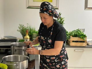 L'incontro, inizialmente teorico e poi anche con una parte pratica ai fornelli, ha riguardato l'utilizzo di erbe aromatiche, erbette e verdura in foglia (bietole, borragine, cavolo nero) in tutte le portate, dall'antipasto al dolce. Finale in bellezza con stuzzicanti crostini spalmati con crema di robiola agli aromi freschi e sorprendenti chips di cavolo nero. Orietta Zaccaro tornerà nel Golfo Dianese a gennaio per una cena a quattro mani in un agriturismo con un menù realizzato con prodotti di stagione a km 0.