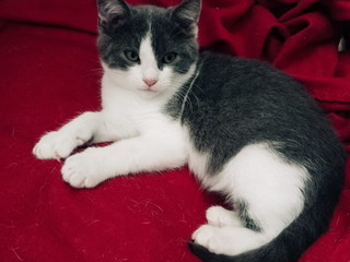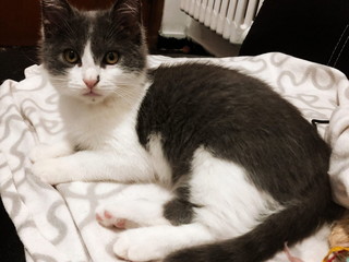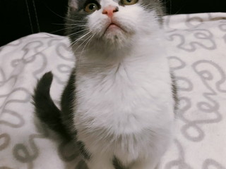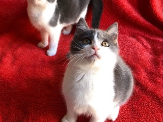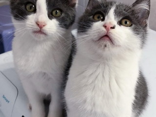 Krapfen e Maritozzo (con macchietta nera sul nasino e sul mento) sono due stupendi maschietti gemellini di circa tre mesi con mantello grigio/blu e bianco (nelle foto).