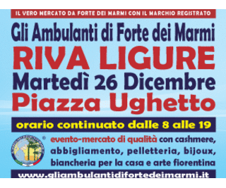 È sempre tempo di festa, di regali e di shopping, e Gli Ambulanti di Forte dei Marmi, le bancarelle del mercato di qualità più famoso d’Italia, tornano a grande richiesta anche nella Riviera di Ponente, con il loro show all’insegna del meglio del Made in Italy artigianale e delle ultime tendenze della moda. Si potranno ammirare le ormai mitiche “boutique a cielo aperto” dell’originale Consorzio il giorno di Santo Stefano, martedì 26 dicembre, a RIVA LIGURE, nella consueta location di Piazza Ughetto e Via Martiri della Libertà. Dunque, un appuntamento da non perdere assolutamente per i tanti appassionati del genere, come sempre all’insegna dello shopping più glamour e conveniente, con orario continuato, anche in caso di maltempo, dalle 8 alle 19.