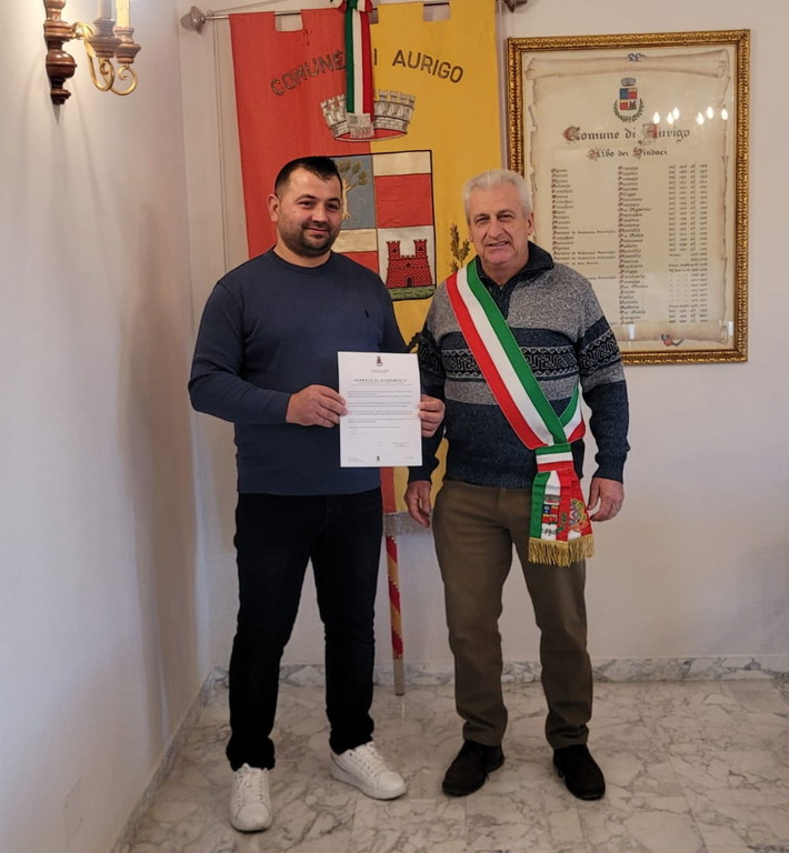 A pochi mesi di distanza da una precedente analoga cerimonia, oggi nella sala del Consiglio Comunale di Aurigo si è svolto il previsto giuramento di fedeltà alla Costituzione che suggella la parte conclusiva del complesso iter previsto per la concessione della cittadinanza italiana ad un albanese residente da oltre un decennio nel piccolo comune della valle Impero. Anche i tre figli minorenni del neo cittadino otterranno li status giuridico del genitore.