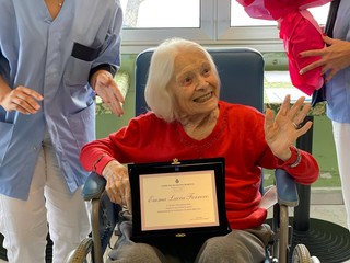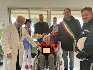 La RSA Montale in festa per il compleanno di Emma Lucia Ferrero, seconda centenaria dianese, che oggi ha ricevuto la visita del sindaco di Diano Marina Cristiano Za Garibaldi e del comandante della polizia locale Gabriele Degl'Innocenti. A festeggiare un'emozionata signora Emma Lucia, il responsabile della struttura Luca Frediani, il dottore Ahmad Al Beik e lo staff della residenza di piazza Papa Giovanni XXIII 1.