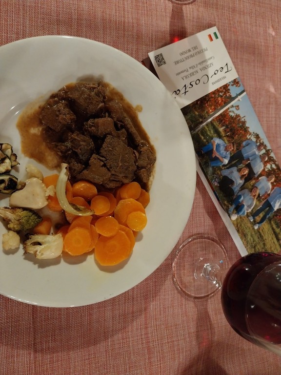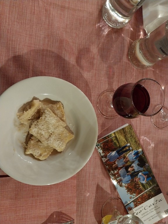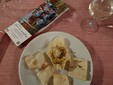 I vini hanno accompagnato un menù tutto ligure: pan fritto, torta verde, cestino di grana per antipasti, ravioli di Mendatica fatti in casa in salsa di noci, capriolo con verdure di stagione e per dolce crostatina alla marmellata.