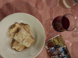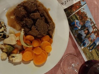 I vini hanno accompagnato un menù tutto ligure: pan fritto, torta verde, cestino di grana per antipasti, ravioli di Mendatica fatti in casa in salsa di noci, capriolo con verdure di stagione e per dolce crostatina alla marmellata.