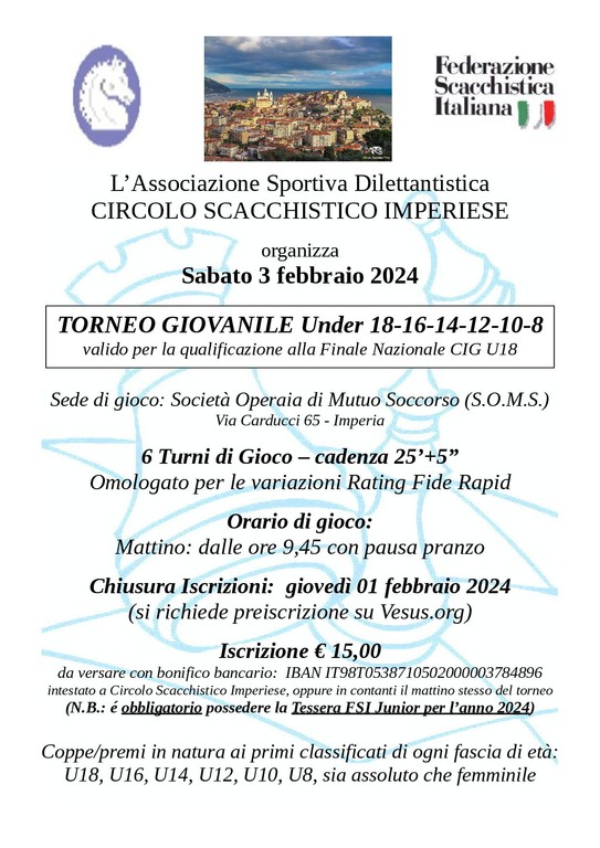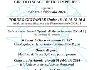 Organizzato dal Circolo Scacchistico Imperiese e sotto l’egida della Federazione Scacchistica Italiana si è svolto sabato 3 febbraio, nei locali della Società Operaia di Mutuo Soccorso di via Carducci ad Imperia dove il Circolo ha sede, un torneo giovanile di scacchi denominato Imperia CIG 2024, dove il termine CIG indica che era valido per le qualificazioni ai Campionati Italiani Giovanili che si svolgeranno in estate a Salsomaggiore Terme.