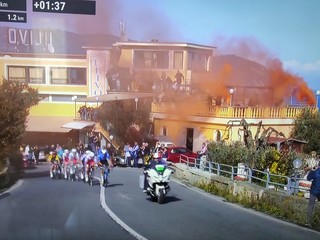 Su Capo Berta i tifosi di Niccolò Bonifazio hanno incitato l’atleta imperiese con fumogeni. Lungo la salita cinque ciclisti sono caduti.