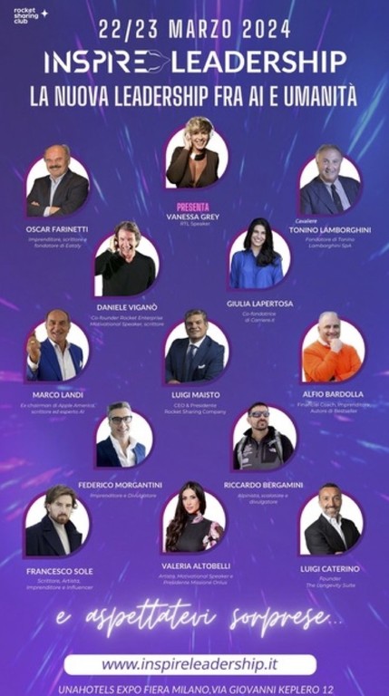 "Inspire Leadership non è solamente un evento di formazione, rappresenta un'opportunità unica per i partecipanti di immergersi in un'atmosfera ricca di ispirazione e conoscenza”, afferma Daniele Viganò, imprenditore e co-fondatore di Rocket Sharing Company. "Siamo onorati di guidare questo movimento verso l'eccellenza imprenditoriale, focalizzando l'attenzione sull'Intelligenza Artificiale e sulla Leadership, temi fondamentali per navigare con successo le sfide del nostro tempo” continua Luigi Maisto.