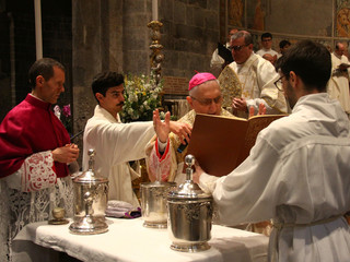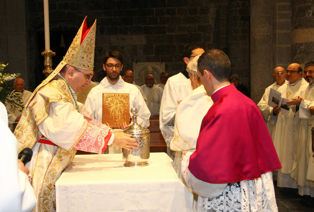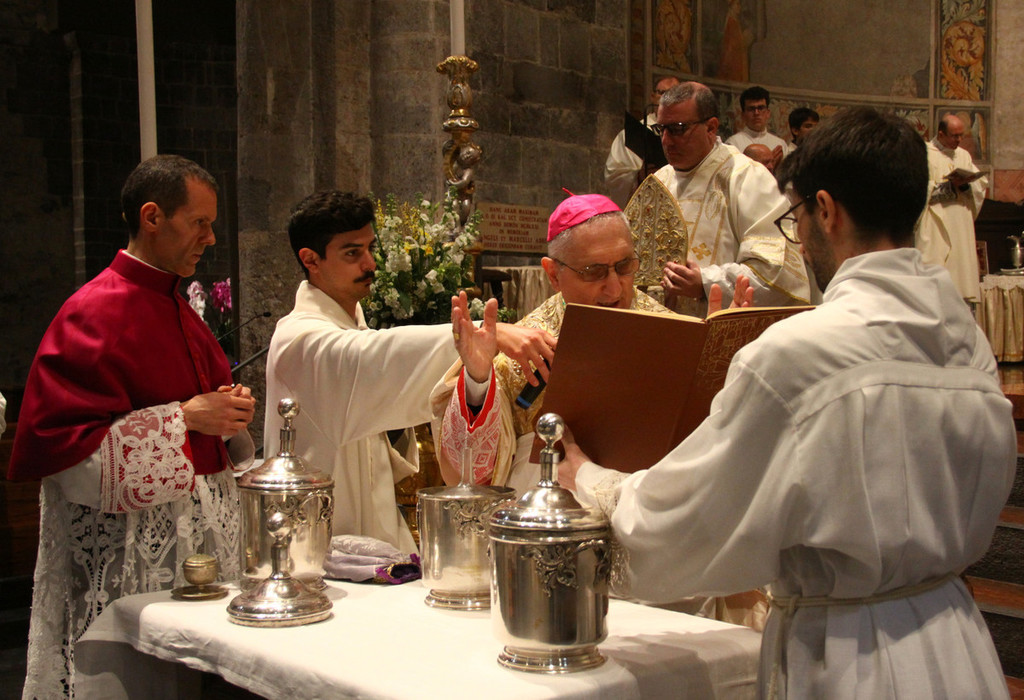 Il vescovo, inoltre, ha compiuto a l'antico rito dell'insufflatio, soffiando sull' olio da Consacrare.