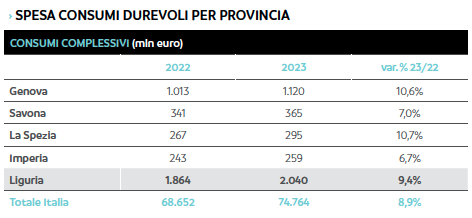 Fra le province, le più dinamiche sono Genova e La Spezia, con aumenti della spesa per famiglia del 10,6% e 10,7%, mentre Imperia è l'unica provincia ligure con una spesa media delle famiglie al di sotto dei 2.600 euro. Nel 2023 la spesa media familiare in beni durevoli è salita a 2.684 euro, collocando la regione al 12esimo posto. A livello provinciale la posizione migliore spetta a La Spezia (2.867 euro), 52esima nel ranking delle 107 province italiane. Staccate di poco Savona e Genova, entrambe tra 2.681 e 2.688 euro, al 62esimo e al 63esimo posto. Il reddito disponibile pro-capite, invece, è salito del 5,1% rispetto al 2022 (pari a 25.596 euro).