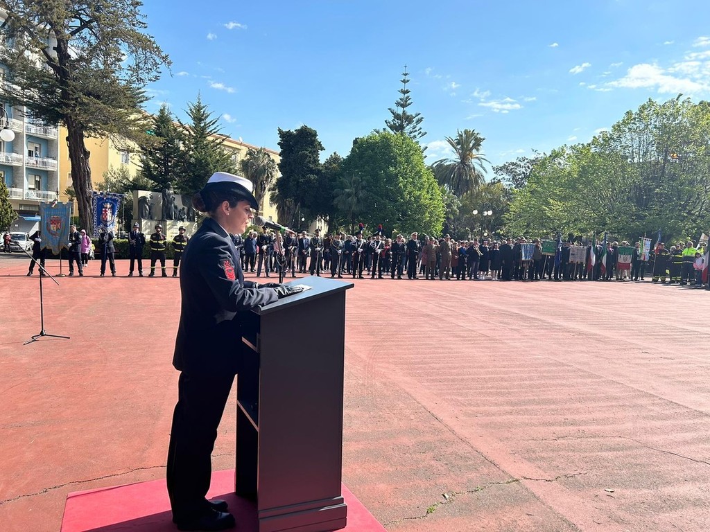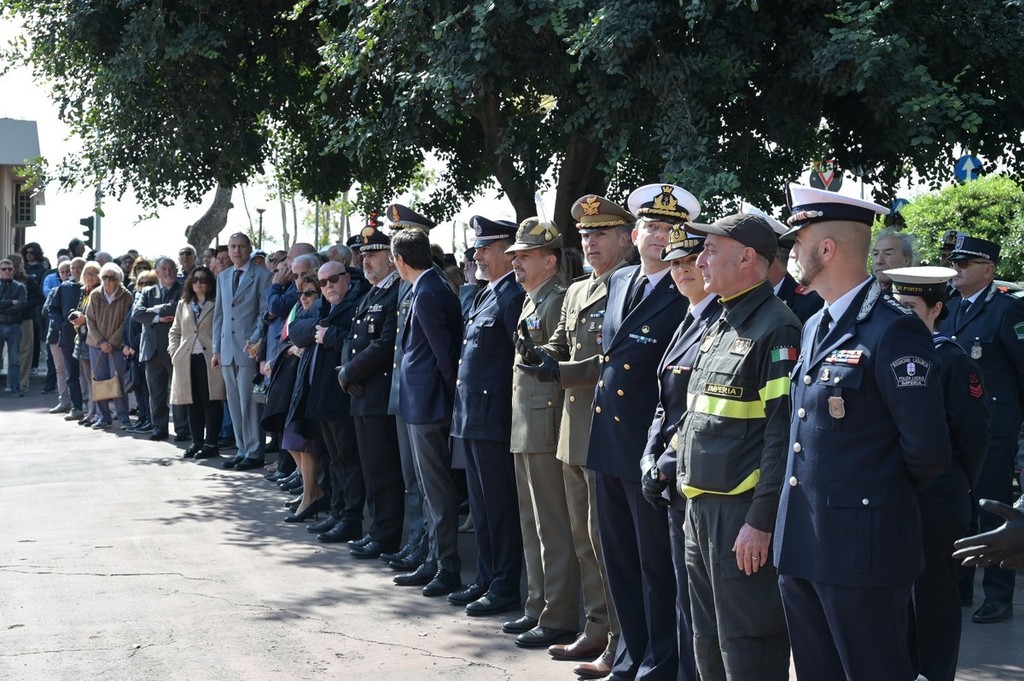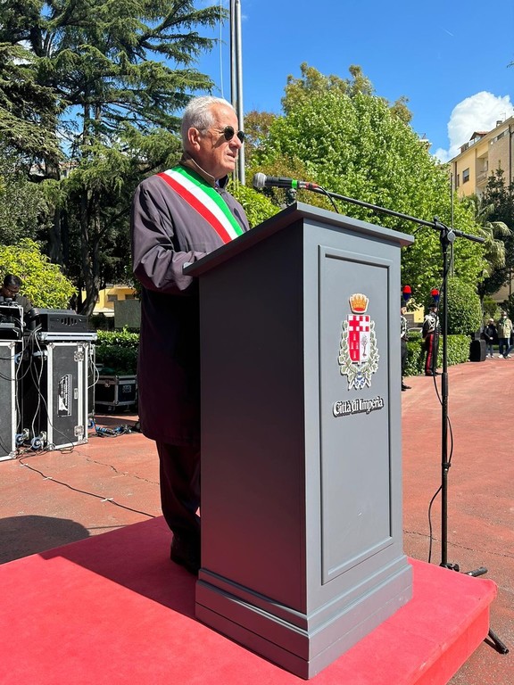Dopo l’alzabandiera, la deposizione della corona d’alloro al Monumento ai caduti e la sua benedizione, si è tenuto il saluto del prefetto Valerio Massimo Romeo, quello del sindaco Claudio Scajola e l’orazione ufficiale di Franco Manzitti, giornalista e scrittore.