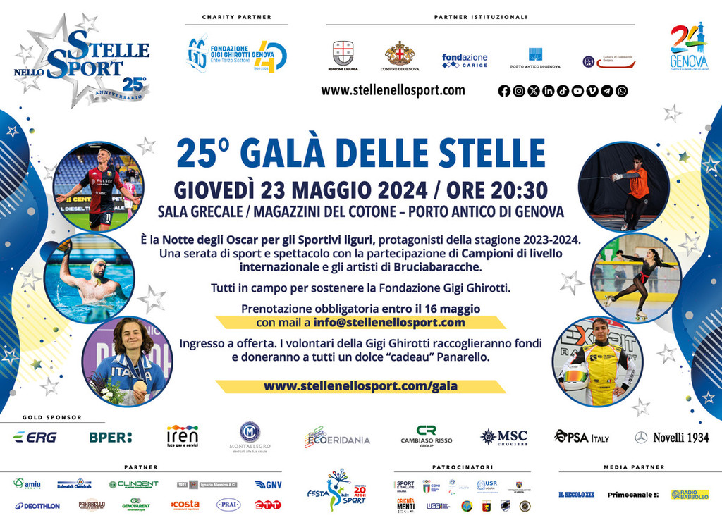 TUTTI IN CAMPO PER LA GIGI GHIROTTI - Il Galà sarà anche l’anteprima della ventesima Festa dello Sport, in programma nei 130.000 metri quadrati del Porto Antico di Genova da venerdì 24 a domenica 26 maggio con uno straordinario calendario di eventi e attività. Eventi che saranno uniti anche dalla mission benefica a sostegno della Fondazione Gigi Ghirotti ETS. Ad oggi sono stati raccolti già 35.000 euro grazie ai proventi dell’asta benefica su Memorabid, ai primi biglietti della Lotteria delle Stelle e alla speciale serata del 4 aprile scorso a Palazzo Ducale con la proiezione del docufilm “25 anni di Stelle nello Sport” e la consegna del premio “Gian Luigi Corti - Un cuore dal Leone” a Giovanni Malagò. Somma che permette di superare la boa dei 500.000 euro raccolti dal 2000 a oggi a sostegno dell’attività della Fondazione presieduta dal Prof. Franco Henriquet.