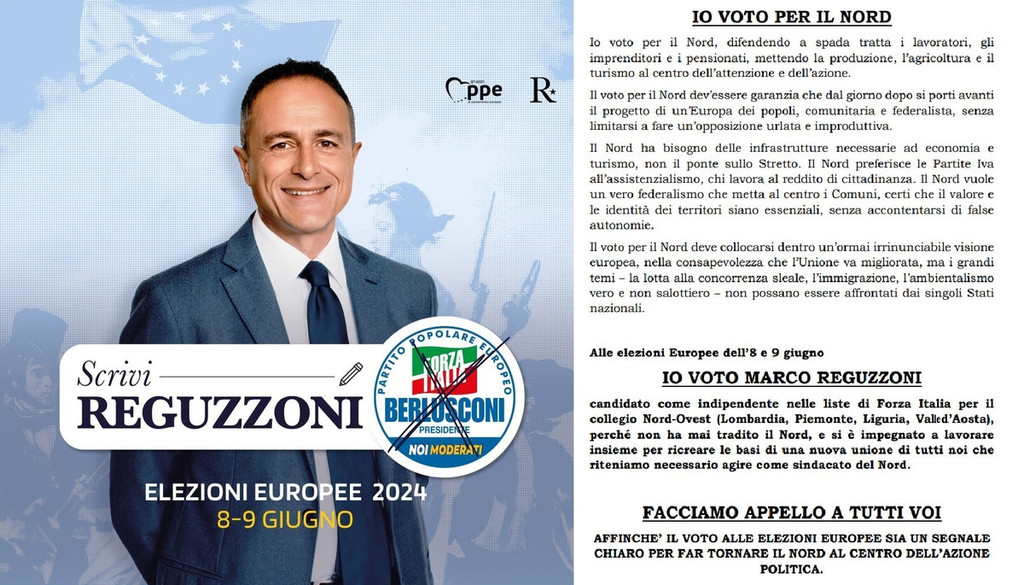 Da Giuseppe Leoni, storico fondatore e primo deputato della Lega, a Giancarlo Pagliarini, già ministro al Bilancio. Da Adriano Teso, imprenditore milanese che Berlusconi scelse come sottosegretario al Lavoro nel suo primo governo, a Giuseppe Bonomi, manager d’eccellenza che ha ricoperto ruoli di vertice in Sea, Anas, Arexpo. Con loro altri mille fra amministratori locali, professionisti, dirigenti, imprenditori, lavoratori e pensionati di ogni categoria, i quali hanno sottoscritto l’appello a votare Marco Reguzzoni da indipendente nelle liste di Forza Italia per le Europee. Un’adesione distribuita sulle quattro regioni del collegio Nord Ovest (Lombardia, Piemonte, Liguria e Valle d’Aosta) per costituire una sorta di sindacato del Nord nel parlamento europeo.