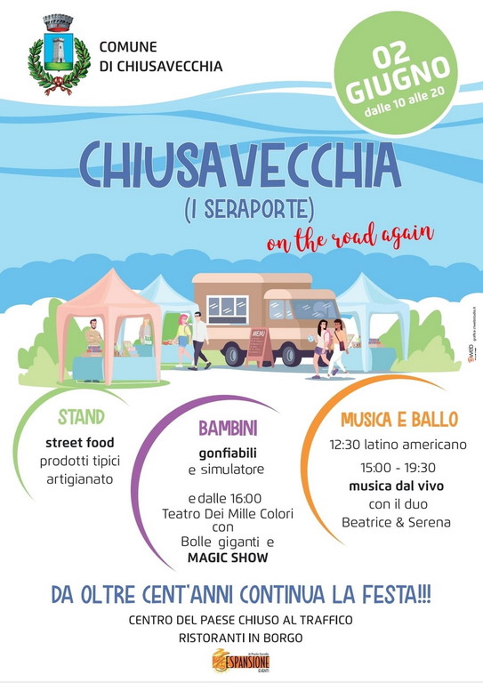 Domenica 2 giugno 2024 ritorna la festa che da oltre cent’anni si svolge a Chiusavecchia. Strada Statale chiusa per una grande festa nel centro del paese (da qui il nome on the road!). Street food con pan fritto, frittelle e carne alla brace con l’azienda Agricola Rambaldi e la collaborazione della Proloco di Montegrosso Pian Latte e le Rostelle della Proloco di Bestagno e il pane del contadino e lasagne del Pastificio Girardi. Birra artigianale, vino locale e gin.