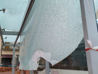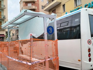 Un tappeto di vetri infranti ha accolto i passeggeri alla fermata degli autobus in largo Nanollo Piana a Oneglia devastata da qualche balordo, come era già avvenuto alcuni mesi fa.
