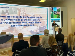 È stato firmato oggi l’accordo di collaborazione tra Regione Liguria e Università degli Studi di Genova, in particolare Dipartimento di Scienze della Formazione, per la promozione dell’acquisizione della lingua inglese all’interno del sistema integrato dalla nascita ai sei anni. A sottoscrivere l’intesa l’assessore regionale alla Formazione Marco Scajola e il rettore dell’Università di Genova Federico Delfino. Si tratta di un primo passaggio fondamentale per arrivare alla sperimentazione dell’insegnamento della lingua inglese ai bambini liguri fin dalla nascita. Regione e Unige condivideranno una ricognizione generale di bisogni, indirizzi e iniziative in corso relative al tema per arrivare alla formazione professionale del personale scolastico in ambito linguistico, con particolare attenzione all’inglese.