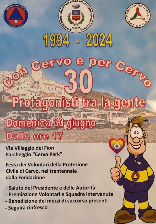 Si svolgeranno domani, domenica 30 giugno, a Cervo le Celebrazioni per il trentesimo anniversario di fondazione della squadra della Protezione Civile di Cervo. L'appuntamento è alle ore 17 nel parcheggio tra via Aurelia e via villaggio dei fiori.